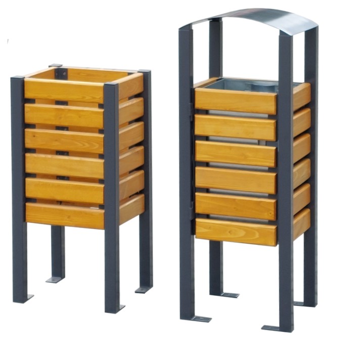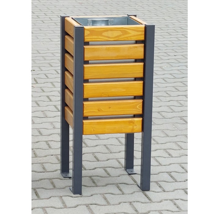 Solidna stalowa konstrukcja z dekoracyjnymi elementami drewnianymi z pokrywą lub bez gwarantują znakomite parametry eksploatacyjne, trwałość przy zachowaniu wszystkich walorów estetycznych. Konstrukcja kosza na śmieci KDB wzbogacona elementami drewnianymi  wyróżnia ten produkt pod względem elegancji. Nie bez znaczenia jest też, ze względu na zastosowane rozwiązania w konstrukcji tego typu koszy a śmieci łatwość przeprowadzania konserwacji czy ewentualnych napraw.